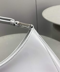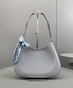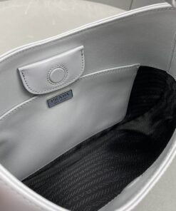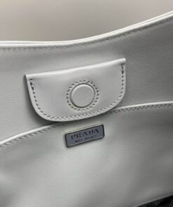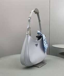 The Prada Cleo bag with sophisticated allure reinterprets an iconic design of the brand from the nineties. The sleek, curved lines emphasized by the particular sloped construction of the bottom and sides give this hobo bag a soft, light look. Brushed a distinctive element of Prada collections, is a modern and versatile material that lends itself to always new combinations and contrasts. The enamel triangle logo decorates the silhouette.
